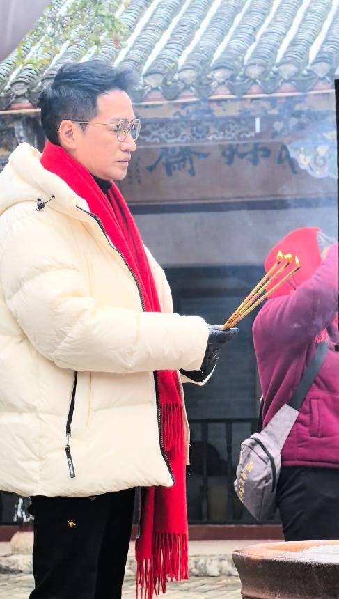 让人意外的是,他不是来安徽游玩,而是特意上山去了寺庙。身上穿件厚实的白色棉袄,围着一条红围巾,在人群里不算起眼,却格外专注。