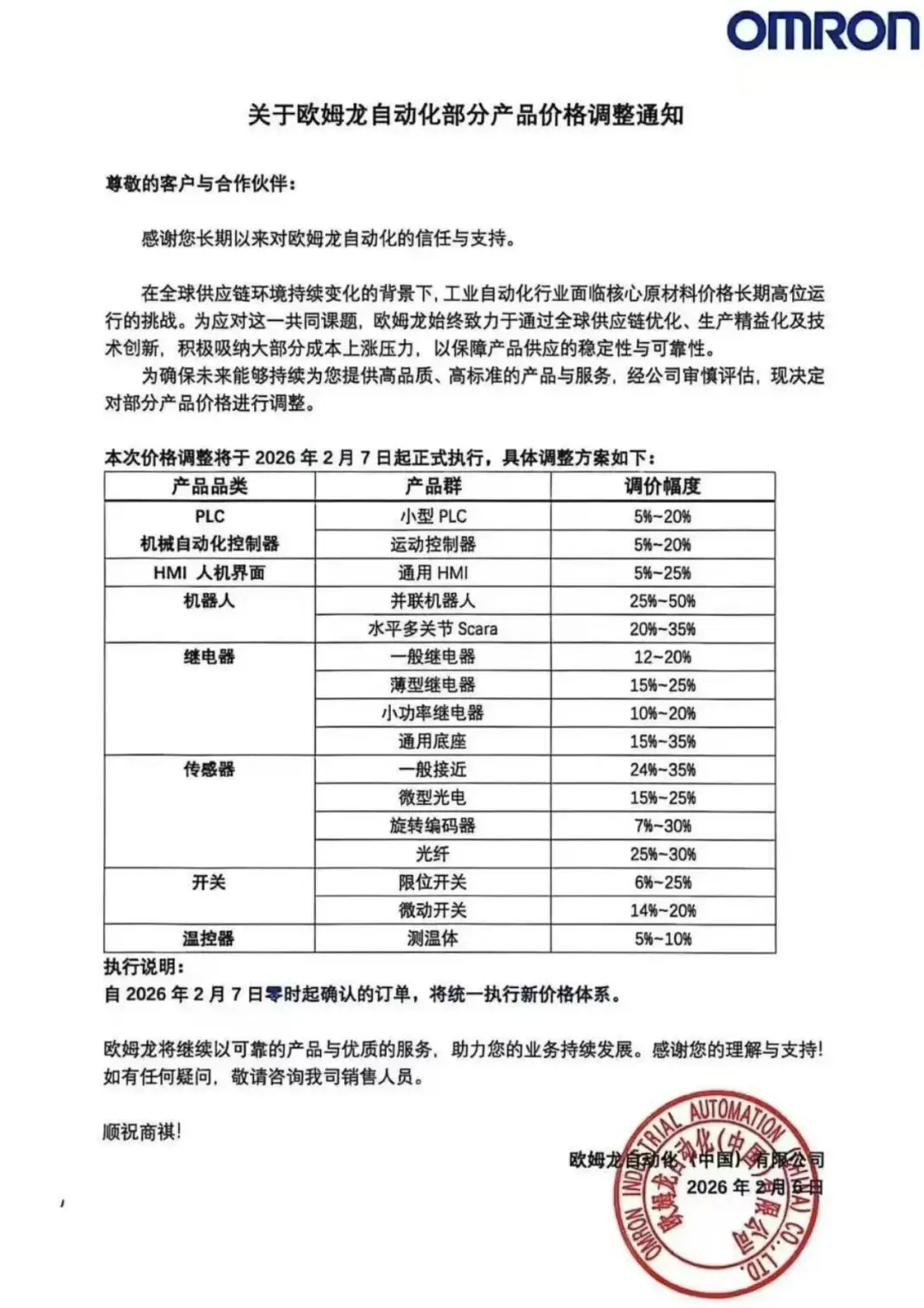 2026年2月6日晚间,欧姆龙通过官方微信公众号“欧姆龙工业自动化”发布了“关于欧姆龙自动化部分产品价格调整通知”,宣布对PLC、运动控制器、机器人相关产品、继电器、传感器、开关、温控器等众多产品进行涨价,涨价幅度为5%-50%不等。新的价格将于2月7日正式执行。